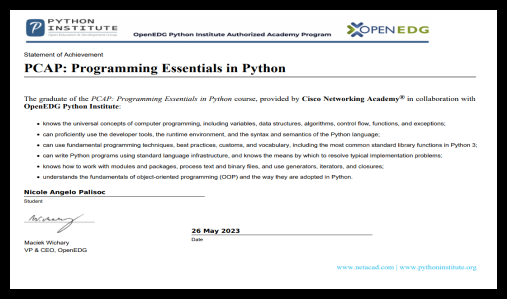 My name is Nicole Angelo Palisoc, and I'm a third-year BSIT student at Guagua National College. Like you, I'm still learning, but I have some knowledge of Python, HTML, and web design.